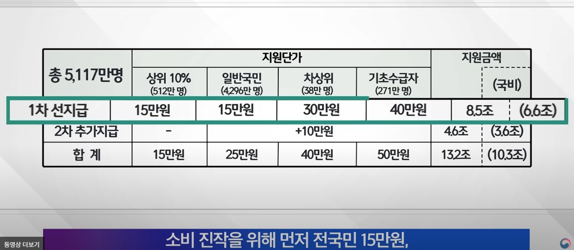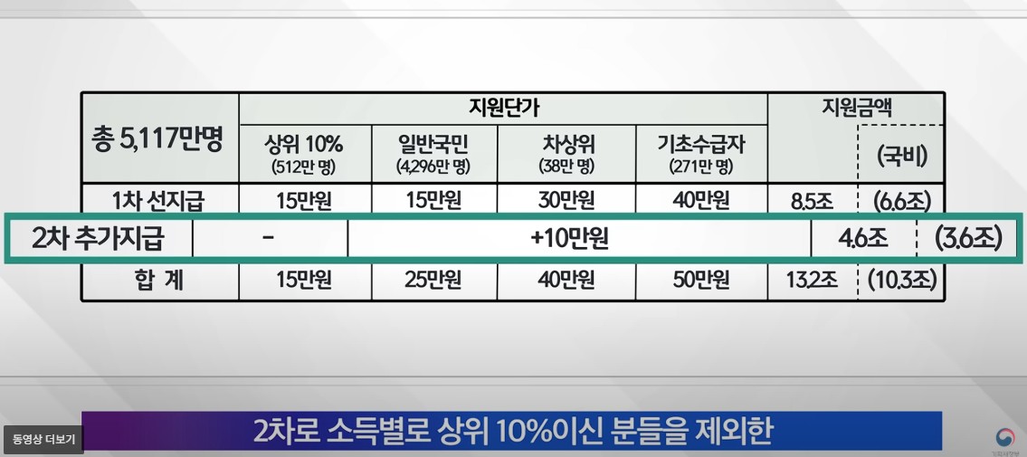 - 2차 지급: 소득 하위 90%에 10만 원 추가 지급
