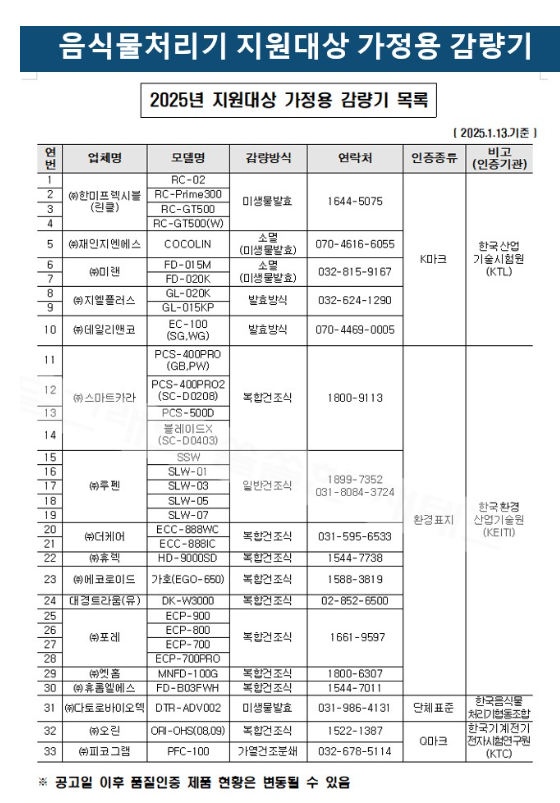 친환경 인증(K마크, 환경표지, KC인증 등)을 받은 발효·건조 방식의 음식물 처리기여야 합니다.