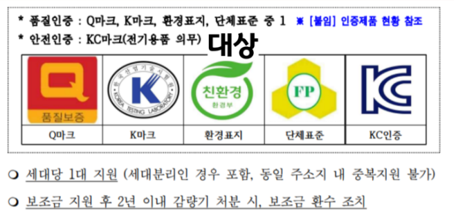 ❗ 지원 대상 제품은 반드시 친환경 마크(K마크, Q마크, 환경표지 등)와 KC 안전인증을 받은 제품이어야 합니다.