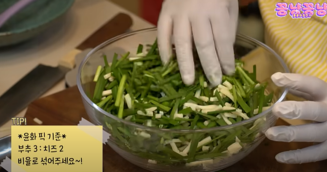 비율은 부추 3 : 치즈 2 정도가 적당합니다. 치즈가 밀가루 역할을 하며 전의 형태를 잡아주는 핵심 포인트랍니다.