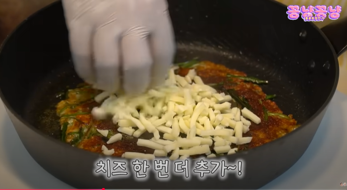 - 뒤집은 뒤에는 불을 줄이고 치즈를 위에 추가로 뿌리고